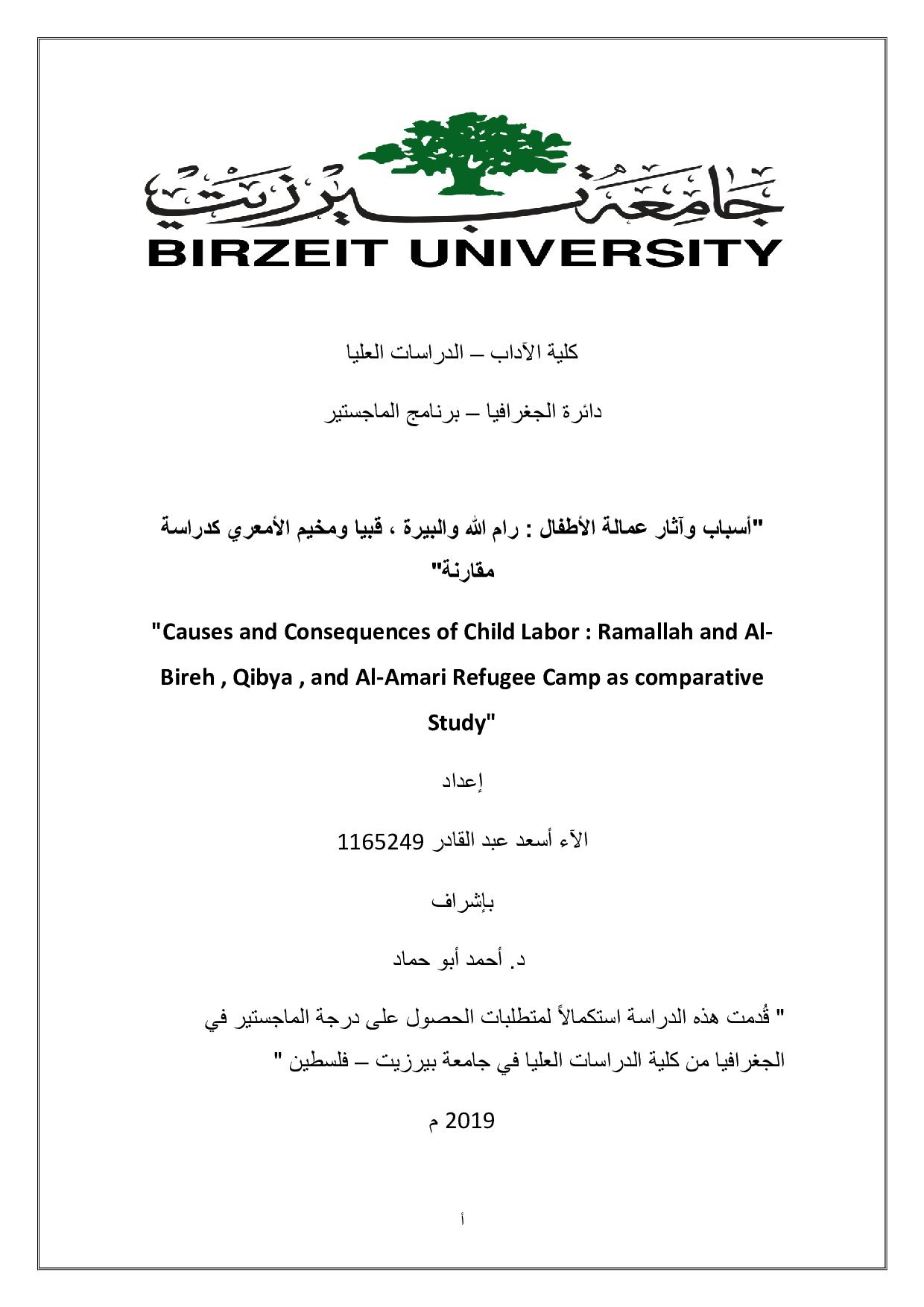 "أسباب وآثار عمالة الأطفال : رام الله والبيرة ، قبيا ومخيم الأمعري كدراسة مقارنة"