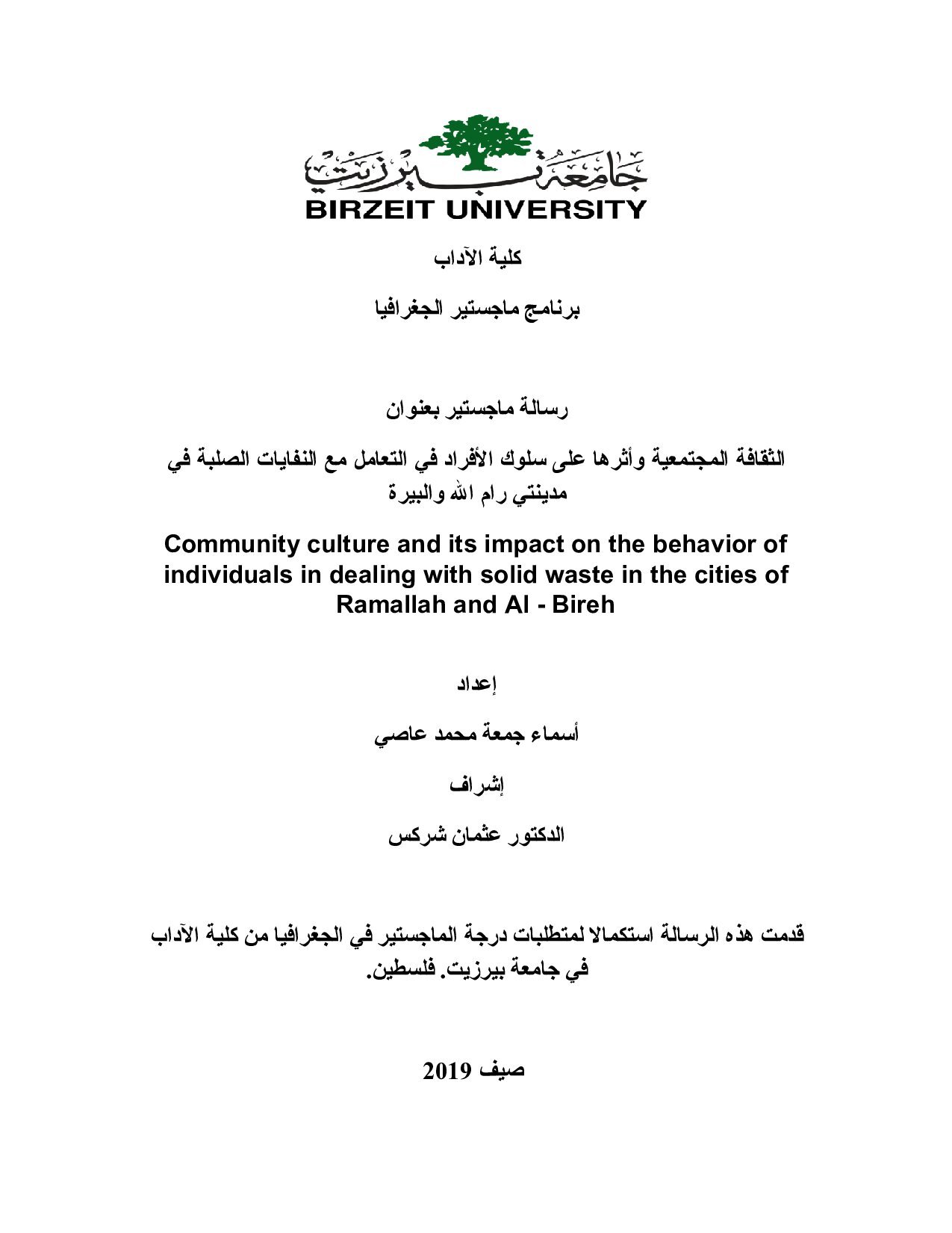 الثّقافة المجتمعیّة وأثرها على سلوك الأفراد في التّعامل مع النّفایات الصّلبة في مدینتي رام الله والبیرة