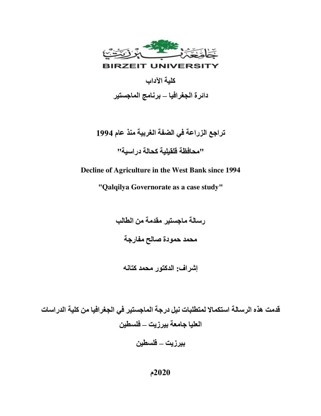 تراجع الزّراعة في الضّفة الغربيّة منذ عام 1994 "محافظة قلقيلية كحالة دراسيّة"